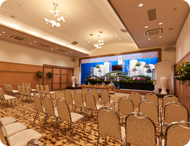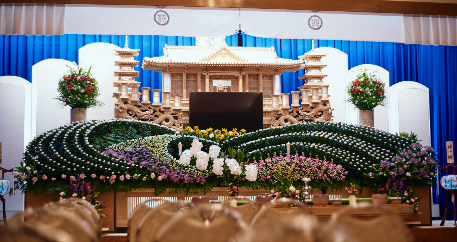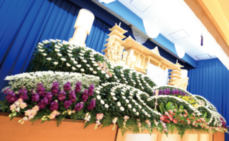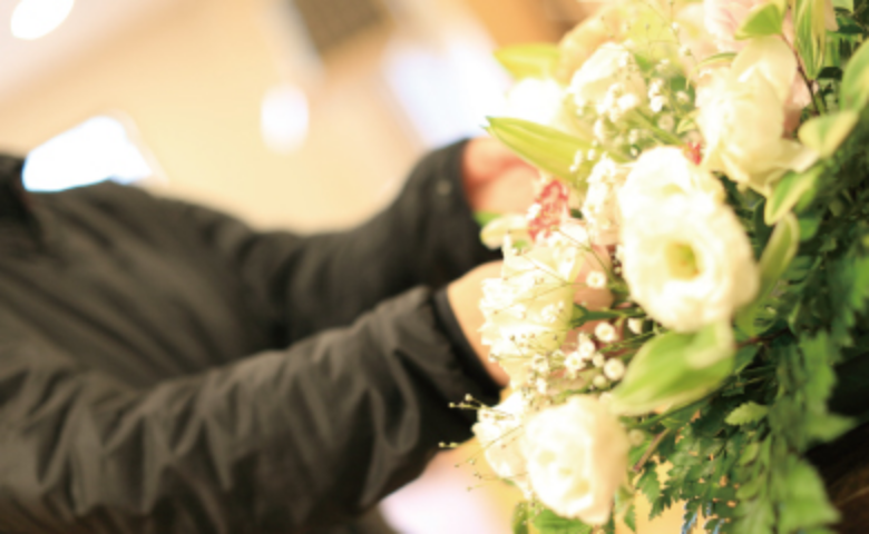 - 弊社、生花部と葬祭部が祭壇から式場のご準備、通夜の司会進行、補助スタッフも含めてトータルにサポートさせていただきます。